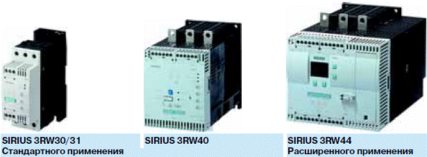 Устройства плавного пуска Siemens представлены серией SIRIUS 3RW в стандартных изделиях 3RW30, 3RW31, 3RW40 и 3RW44 — специального назначения. Устройства плавного пуска Siemens SIRIUS 3RW прдназначены для пуска: вентиляторов, строительных машин/смесителей, эскалаторов, кондиционеров, конвейеров, приводов, насосов, прессов, транспортеров, воздуходувок, компрессоров и холодильников.
